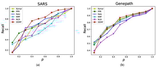 The parameters of five other comparative algorithms are adjusted to be close to the optimal ones in the four networks. The specific values are as follows: is taken from the Ksmar indexes, is taken from the PPR indexes, and is taken from the Katz indexes. In the NMF algorithm, random walk length is valued as 10, embedded vector length is set to 128, and hyperparameters . In the NLD algorithm, the selection method of known important nodes is the same as that of the DDMF method. The experimental results of the three evaluation indexes are shown in Figure 2 and Figure 3 and Table 2.