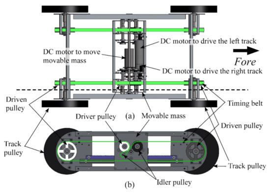We propose a novel mechanism to transmit the driving force for each rubber track while its driving motor moves forward and backward in the movable mass. The CAD of Dyjob presented in Figure 4a,b shows, respectively, the top view and the right-hand side view at the dashed cross section in Figure 4a (the rubber tracks are omitted from the CAD). The driver pulley is turned by the DC motor for driving each track via the gear reduction mechanism, and the fore and rear driven pulleys are turned using the timing belt. Tension is applied by the two idler pulleys to prevent the belt from slipping off. The fore and rear final track pulleys are turned with the driven pulleys.
