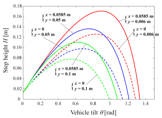 Figure 8 shows the relation between the vehicle tilt () and step height () based on Equation (6) for Dyjob () with several COG positions determined by the different values of and . The red dashed and solid lines show the cases in which the movable mass is fixed (i) in the center O () and (ii) in the forwardmost position, i.e., (142 mm forward from O), respectively. In cases (i) and (ii), Dyjob is assumed to be able to climb steps of 0.126 m high when = 0.84 rad and 0.171 m high when = 0.89 rad, respectively. Therefore, Dyjob should place the movable mass as far forward as possible (i.e., ) in Step 2.