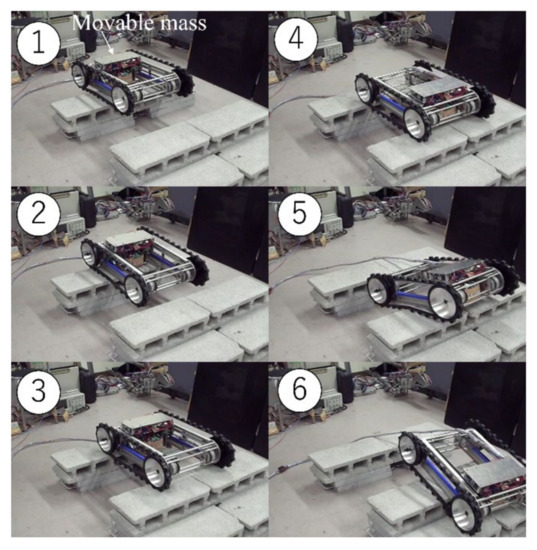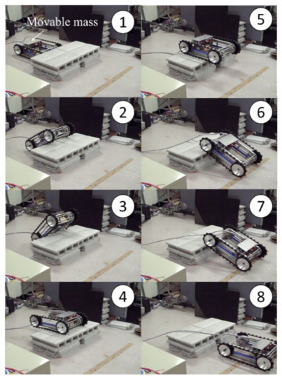 In Step 1, the tracks slipped on the ground and the step wall with the movable mass kept in the center, thus preventing Dyjob from lifting its front end onto the step. Moving the movable mass the furthest backward, as shown in No. 1 in Figure 9, allowed the front end of Dyjob to move up onto the step, as shown in No. 2. It is similarly observed in Figure 10 that because the movable mass was placed the furthest backward between No. 1 and 2, Dyjob was able to tilt up to approximately 0.6 rad.