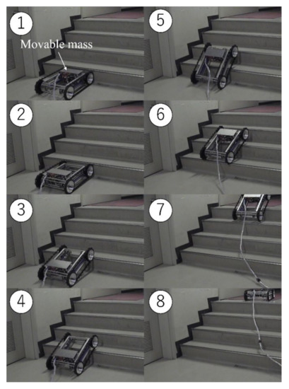 For Step 3, the operator moved the movable mass the furthest backward between No. 4 and 5 of Figure 9 and Figure 10 to safely land Dyjob on the ground. Subsequently, Dyjob moved forward, and the front end landed on the ground without the vehicle turning over, as shown in No. 6 of Figure 9. In the case that Dyjob proceeded while keeping the movable mass forward, as shown in No. 4 of Figure 9, Dyjob was vertically tilted down in No. 6 of Figure 9, thereby flipping over. If the rear end falls from the step while the movable mass was kept backward, as shown in No. 6 of Figure 9, the devices in the mass will be damaged. Therefore, the operator moved the mass forward, as shown in No. 7 of Figure 9, and Dyjob safely landed on the ground, as shown in No. 8 of Figure 9.