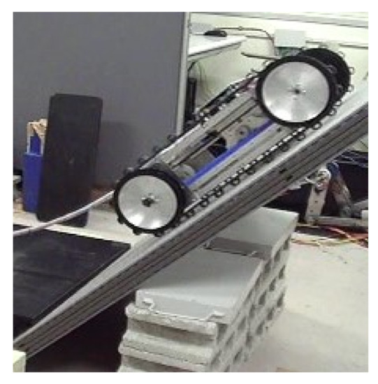 We propose a novel mechanical design in which most of the internal devices can be longitudinally moved, enabling the COG to be significantly shifted at a low level. The movable mass incorporates DC motors for driving both tracks in addition to a DC motor for driving the mass itself and electric devices, such as motor drivers, an on-board computer, and batteries, thus raising the weight ratio of the movable mass to the other parts. This allows a relatively long range of COG movement at a low level, enabling the vehicle to climb a high step without any particular external movable mechanism. Another advantage is that a vehicle without external parts, as shown in Figure 1, can progress even in the worst-case scenario of the UGV turning upside down.