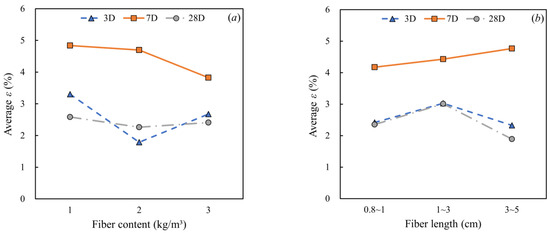 To investigate the effects of RS fiber length and content, the average peak strains of the RSCPB at different contents and lengths are plotted in Figure 10. Figure 10a shows the effect of the added content of RS fibers on the peak strain of the RSCPB, which indicated that the peak strain had the same changing rule under the influence of different fiber lengths when the curing ages were 3 days and 28 days. With the increase in RS fiber content, the average ε of the RSCPB decreased and then increased. The peak strain reached the maximum value when the fiber content was 1 kg/m3, and the peak strains on the 3rd day and 28th day were 3.300% and 2.583%, respectively. At 7 days of curing age, the peak strain decreased continuously with the increase in fiber content. The maximum ε was 4.840% at a fiber content of 1 kg/m3.