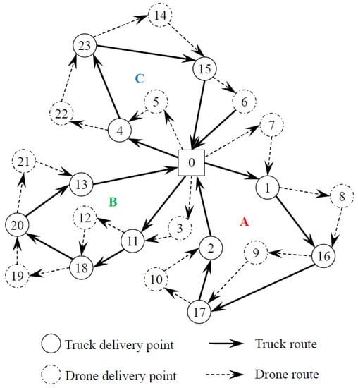 - All trucks have the same service time at each customer point, and all drones also have the same service time at each customer point.