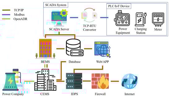 The system architecture proposed in this paper has been applied in the national infrastructure with strict requirements for security. Defenses against DoS attacks usually include attack inspection, traffic filtration, and multiple verifications. In order to address the aforesaid problems, this paper proposed an encrypted verification mechanism based on tokens and the transport layer security (TLS) protocol [] to prevent hackers using the external internet to attack firewalls and Intrusion detection and prevention systems (IDPS), access the BEMS, and successfully use DoS attacks against the SCADA Server. The contribution of this paper has been applied and verified in the energy management system of a Smart Green Energy Science City in southern Taiwan; thus, it is proved that DoS attacks can be effectively defended by adding an encrypted verification mechanism. In addition, spending a bit more in the calculation, transmission, and storage can prevent the system’s control system from failing to capture a device’s response and sending repetitive requests, which may cause errors due to the inability to access device information and even overwhelm the system. According to experimental results, the security defense architecture proposed in this paper is effective in improving security and compatible with real field systems.