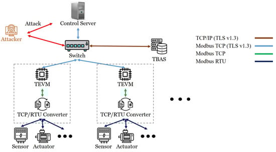 As can be seen in Figure 2, a server named Token-based Authentication Service (TBAS), which is responsible for generating tokens for legitimate devices, was added to the SCADA system architecture. In addition, a Trusted Encrypted Validator module (TEVM) machine was added to the TBAS system to encrypt, decode, and verify the device’s legality. As the major medium applied program of the SCADA server, the Control Server (CS) was in charge of controlling IoT devices, and the secure connection among CS, TEVM, and TBAS was achieved through encryption by TLS 1.3. This paper proposed a solution named the encrypted authentication mechanism, which could address security problems in two ways; the first encrypts Modbus TCP through Transport Layer Security 1.3, meaning hackers could not access or modify the content, and the second verifies CS and IoT devices through tokens to stop hackers from paralyzing the SCADA system through DoS attacks.