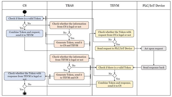 Above all, prior to CS sending out regular requests or control requests from BEMS, the TEVM would check to determine whether the token is legitimate. If the token did not exist or was illegitimate, then, CS must apply for a legitimate token and provide the required information to TBAS during application. Upon receiving the application from CS, TBAS would examine its information legality, and if legitimate, the token would be generated and sent simultaneously to CS and TEVM, if not, CS would receive a message explaining the wrong information and the need to reapply. After receiving the message from CS, TEVM determines whether the token is legitimate and consistent with that from TBAS. If so, the requested information would be sent to the PLC/IoT Device; if not, a message explaining the incorrect information would be sent to CS accompanied by a request to reapply for the token. After receiving such requests, PLC/IoT devices are required to take immediate and specific actions, and send reply messages to TEVM. Then, after receiving this reply, TEVM would examine if there was legitimate token within itself. If there was no legitimate token, it would send the requested information to TBAS to apply for a token; if a legitimate token existed, it would send the combined token and reply to CS. After receiving the application for a token from TEVM, the TBAS procedure would follow the same procedure used when CS applied for a token. Finally, when CS received information from TEVM, it would also check whether the token was legitimate and consistent with that of TBAS. If an inconsistency is found, it would reject the message and reply to TEVM with the wrong information and a request to reapply; otherwise, TBAS would save the replied information to the database. The complete procedure of the identity authentication mechanism is shown in Figure 3.