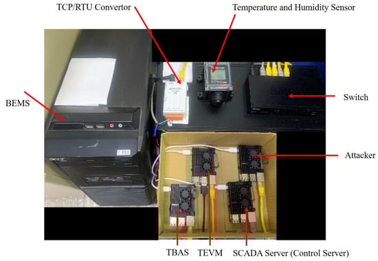 During practical operation, this study adopted a physical server as the control server to send the access requests of IoT devices. One Raspberry Pi was adopted in TBAS to examine the legality between the control server and IoT devices and generate token in accordance with the results. Another Raspberry Pi was employed in TEVM to encrypt and decode pockets and verify the module. An ICP DAS tGW-735 device was used in the TCP/RTU Converter. The IoT devices used the temperature and humidity sensor of ICP DAS DL-100TM485. The simulated experimental environment is shown in Figure 4, and the actual environment is displayed in Figure 5.