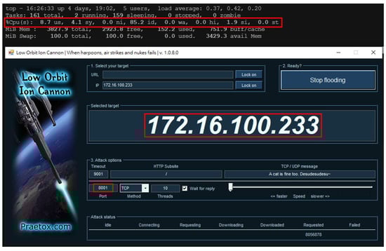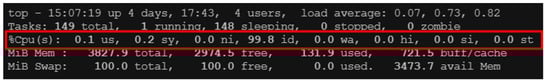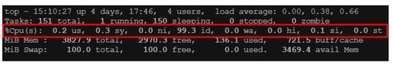 Later in the experiment, the BEMS was used as the attack node to launch the denial-of-service attacks through the LOIC tools on SCADA servers without a preventive mechanism, but with the TEVM mechanism. Figure 9 demonstrates the situation without any defensive mechanism; the us and sy values were much higher than the common values, and the id value was close to zero, which indicates that the denial-of-service attack could paralyze the CPU, and render it incapable of possessing other tasks. Hence, it can be concluded that, when there is no security mechanism, the SCADA server can be attacked and disabled by a denial-of-service attack. Figure 10 illustrates the SCADA server with the TEVM mechanism, which shows that a lot of resources remained in the system to carry forward other tasks, and indicates that the encrypted authentication mechanism could effectively defend against denial-of-service attacks.
