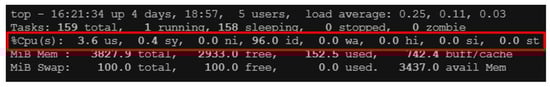 Before verifying the effective defense of TEVM against DoS attacks, it should be proved that the SCADA system can be influenced by DoS attacks when there is no security mechanism. As the denial-of-service attack would exert an extraordinary burden on the CPU, this study explored the influence of an attack according to the usage frequency of the CPU. In addition, this paper adopted Top, which is an instant analysis tool built in the Linux system, to examine the usage frequency of the CPU. Prior to adding the TEVM mechanism to the SCADA server, when the system was idle, this study recorded some of the major information among all system parameters, as shown in Figure 6: (1) us: the percentage of the CPU used by the user space in the Linux system; (2) sy: the percentage of the CPU used by the kernel space in the Linux system; and (3) id: the idle percentage of the CPU. Before adding the TEVM mechanism, the SCADA server accessed the high frequency usage information in the single temperature and humidity sensors, which presented the usage conditions of various system parameters when taking corresponding actions per the BEMS request. As shown in Figure 7, the CPU usage percentage was 99.3% idle; thus, while the SCADA server was running, it was not busy. However, Figure 8 shows the situation of integrating the TEVM mechanism into the SCADA server; in this case, us, sy, and id account for 3.6%, 0.4%, and 96%, respectively, which indicates that running this mechanism would not have a huge impact on the SCADA server.