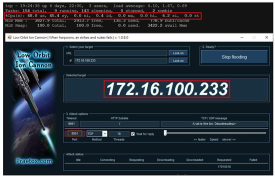 A distributed denial of service attack is an attack that maliciously reduces the performance of a website or server. Distributed attack uses multiple computers in a distributed network to use DoS to attack the target website or server. Multiple computers send a large number of fake requests to the target. Targets are flooded with such requests, making legitimate requests or users unable to use resources. The types of DDoS attacks can be roughly divided into volume-based attacks, protocol attacks, and application layer attacks. Attack methods include UDP flood, ICMP flood, SYN flood, Ping of Death, Slowloris, NTP Amplification and HTTP flood. The HTTP Unbearable Load King (HULK) DDoS attack tool [] will have devastating consequences when implemented, because it is executed in a form to evade most firewall rules. HULK generates unique and obscure traffic, so the authentication mechanism can effectively block HULK attacks. The Slowloris attack tool [] is to send authorized HTTP traffic to the server. For the evaluation of parameters such as attack time, traffic rate and packet size [], Slowloris makes the attack at a slow rate, so it is easy to detect the traffic as abnormal and block it. The LOIC attack tool [] is mainly to send UDP, TCP and HTTP requests to the server. The HIVEMIND mode of LOIC tool will allow remote control of other computers in the Zombie network. LOIC tool is very easy to use, and the target website can be defeated and stop responding to actual requests within a few seconds. Therefore, this paper uses LOIC tools to quickly simulate the experimental situation.