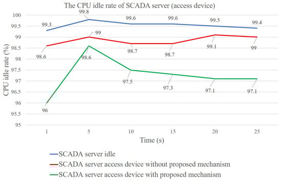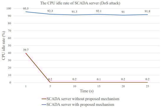 Figure 11 displays the idle situation of the SCADA server’s CPU when the SCADA system was running. The X-axis is time in different periods and the Y-axis shows the idle percentage of the SCADA server’s CPU. Three lines in different colors show the idle percentage of the CPU under different circumstances: the blue line is under the condition that the SCADA server runs no service, the red line shows how the SCADA server runs to access one temperature and humidity sensor, and the green line is when the SCADA server runs to access one temperature and humidity sensor after adopting the TEVM mechanism proposed in this paper. According to the line graph, while no great difference can be distinguished between the idle server and the server running without employing an encrypted authentication mechanism, the CPU in the server with the TEVM mechanism has been used a little more frequently. Figure 12 presents the assumption that hackers have destroyed the BEMS and controlled it to launch DoS attacks to the SCADA server through LOIC. The X-axis is time in different periods and the Y-axis shows the idle percentage of the SCADA server’s CPU. The red line represents the situation when the SCADA server adopted no encrypted authentication, while the blue line represents the SCADA server employing the TEVM mechanism. If no protective mechanism was applied, the SCADA server would be easily disabled by hackers’ DoS attacks; however, when the TEVM mechanism was used, DoS attacks were effectively defended.