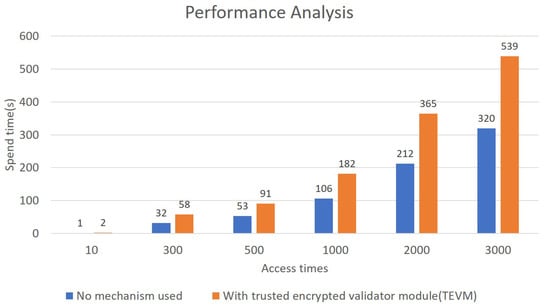 Figure 13 shows the performance analysis of SCADA server (Control server, CS) accessing a single Internet of Things device. The horizontal axis is the number of times that CS accessed the Internet of Things device, while the vertical axis is the time spent on such access. The blue bar denotes that no encryption verification mechanism is executed, and the orange bar denotes that the complete encryption and verification mechanism is executed. In the experimental analysis, the average access time without the encryption verification mechanism is 105 ms, and the average access time with the complete encryption and verification mechanism is 186 ms. It can be found that the time consumed by executing the complete encryption and verification mechanism is about 1.7 times that of no encryption verification mechanism. However, from the data point of view, it takes a lot of time. In fact, the time consumed in both cases is very short. In addition, in practice, the SCADA system does not have too strict requirements regarding the access time of most Internet of Things devices. Furthermore, we learned from the system integrator that the average time from transmission to response must be controlled within 1 s when integrating this mechanism. Adding to this, according to expert’s recommendation, it only requires that a reply is received from Internet of Things devices within 1–2 s. Therefore, the mechanism proposed in this paper is efficient and in line with the demand in the actual field.
