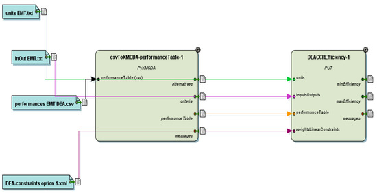 The DEA method model has been implemented by using the Diviz software. Figure 2 shows the Diviz workflow to implement the DEA model with restrictions over the weights [77].