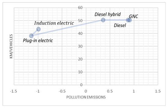 Specifically, it is analysed which engines are able to cover the same kilometers while emitting fewer pollutant gases. Therefore the output data or the service indicator used is the number of kilometers per vehicle for each type of engine, and the input data or the pollutant emission indicators are the NOx (kg), PM (kg) and CO2 (kg) emissions for each engine type.