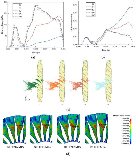 A bird strike will produce a transient impact on the bearing, and the response of the bearing depends on the stiffnesses and damping of the bearing system, which in turn, influences the bird impact response [22]. It can be seen in Figure 11a,b that the stiffness has a great effect on the bearing force of the rotor. The bearing forces are 193, 139 and 47.3 kN in the cases of G, S1, and S2. It is known that when the bearing stiffness is larger, the resulting bearing force is greater, and the displacement of the shaft center is smaller. The displacements of different stiffness are 1.93, 2.78, and 4.71 mm, respectively, for the cases of G, S1, and S2. Therefore, higher stiffness leads to higher stability in the fan after impact. The damping has less effect on the bird strike, and there is not much difference between the cases of G, D1, and D2. Figure 11a,d show that the stiffness and damping of bearings do not have a substantial influence on the bird strike process and the von Mises stress distribution of the blade. The same conclusion can be drawn from the results in Table 8. The kinetic energy gain of the bird is very similar for all the cases of G, S1, S2, D1, and D2.