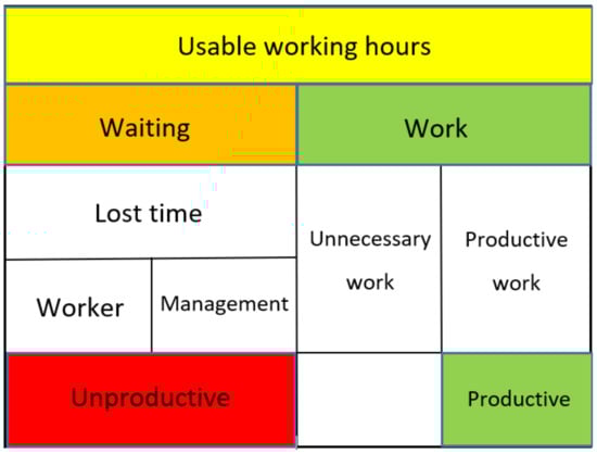 According to [,,], it is important to know the consequences for the overall production when defining waste. Recognizable consequences of waste include unused machines, work in progress, high stocks, overloaded workers, high error rates, ineligible processes, hazardous work, work in non-ergonomic working positions and conditions, complex material flows, and constant slippages in the plan. As reported by [], production distinguishes two crucial dimensions of performance: quality and productivity. Productivity is then defined as the number of quality-compliant outputs produced per unit of each source (input) used. Quality is measured by the extent to which a product meets the specificities of its design. Continuously increasing productivity is one of the most important objectives of management. It is also one of the most difficult, as productivity means finding a balance between a variety of factors, few of which are easily defined or easily measurable [].
