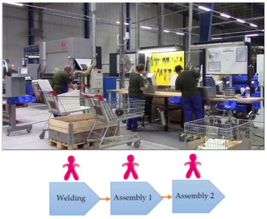 The production of fire dampers takes place on the production line in two shifts. Three workers work on each shift. Production is carried out at three sites, as shown in Figure 2.