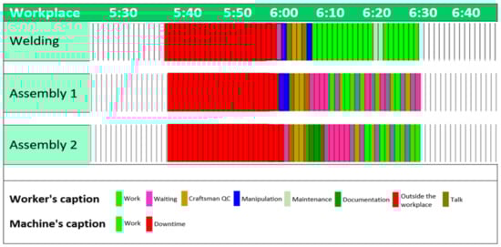 For the analysis of waste, measurements of the onset of shifts were also performed, which were evaluated at two levels. First, the onset of the morning shift was evaluated (Figure 3) once. It was found that the workers arrived at the workplace 2 min before the start of the work shift.