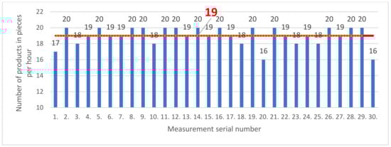 Based on 30 counts of the number of products produced per hour, the average initial hourly output on the production line was calculated to be 19 pieces of products per hour (Figure 4).