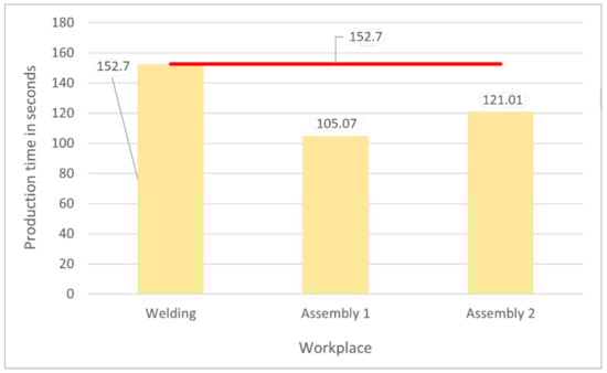 As the individual workplaces on the production line can also work in parallel, to use the method of balancing activities across individual workplaces, it was necessary to determine the workload of individual workplaces and determine which had the highest. Based on the analysis of the duration of individual operations in the production line workplaces, the initial state of work and balance of the production line workplaces was determined, see Figure 5. The highest workload was found at the Welding workplace at 152.7 s per product.