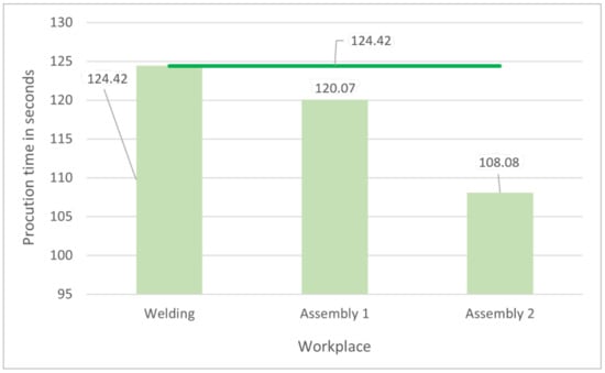 The next step was to analyze the possibility for employees from the Assembly 1 and Assembly 2 workplaces to assist in selected operations at the Welding Workplace. As part of the balancing between the workplaces, a 15 s help from the Assembly 1 workplace at the Welding workplace was proposed, which would reduce the duration of the Welding operation from the original 152.7 s to the new 124.42 s (Table 6).