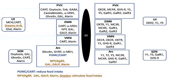 Schematic representation of the main hypothalamic regions implicated in the control of food intake. Neuroactive substances involved in feeding regulation are represented at the right side of the image, and receptors are represented at the left part of the schema. Abbreviations: 3V—third ventricle; AgRP—agouti-related peptide; Arc—arcuate hypothalamic nucleus; α-MSH—alpha-melanocyte stimulating hormone; CART—cocaine and amphetamine regulated transcript; DMN—dorsomedial hypothalamic nucleus; Enk—enkephalins; GABA—gamma-aminobutyric acid; GAL—galanin; GALP—galanin-like peptide; GalR1—galanin receptor type 1; GalR2—galanin receptor type 2; GalR3—galanin receptor type 3; GHRF—growth hormone-releasing factor; Glut—glutamate; GHS-R—growth hormone secretagogue receptor; LH—lateral hypothalamus; MC3R—melanocortin receptor type 3; MC4R—melanocortin receptor type 4; MCH—melanin-concentrating hormone; NPY—neuropeptide Y; OX1R—orexin receptor 1; OX2R—orexin receptor 2; OXTR—oxytocin receptor; POMC—pro-opiomelanocortin; PVH—paraventricular hypothalamic nucleus; SON—supraoptic nucleus; VMN—ventromedial hypothalamic nucleus; Y1—NPY receptor type 1; Y2—NPY receptor type 2; Y5—NPY receptor type 5.