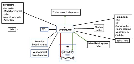 Relationships between different hypothalamic and extrahypothalamic regions involved in the control of feeding. Orexinergic neurons of the lateral hypothalamus send direct projections to other hypothalamic nuclei (posterior hypothalamus), different regions of the brainstem and spinal cord as well as forebrain structures and receive inputs from the median raphe or the ventromedial hypothalamus. Green arrows represent direct activation exerted from the orexinergic neurons to thalamo-cortical neurons, the ventral tegmental area or the NPY/AgRP neurons of the arcuate nucleus, and the red arrow represents the inhibitory projection from orexigenic neurons to POMC/CART neurons of the arcuate nucleus. Abbreviations: Acb—accumbens nucleus; Arc—arcuate hypothalamic nucleus; LC—locus coeruleus; LH—lateral hypothalamus; NPY/AgRP—neurons of the arcuate nucleus containing neuropeptide Y and agouti-related peptide; PAG—periaqueductal gray matter; POMC/CART—neurons of the arcuate nucleus containing pro-opiomelanocortin and cocaine- and amphetamine-regulated transcript; PVH—paraventricular hypothalamic nucleus; VTA—ventral tegmental area.