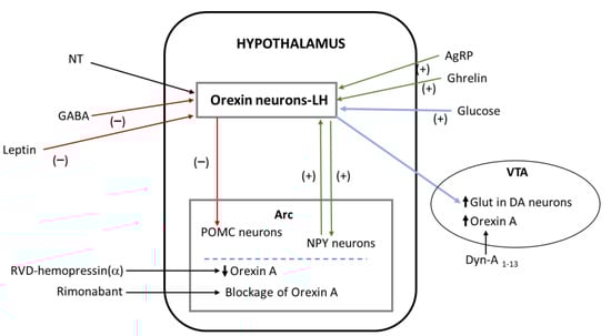 In this regard, it was reported that orexins A and B, synthesized by neurons of the lateral hypothalamus, activate NPY/AgRP neurons located in the hypothalamic arcuate nucleus and that this projection is reciprocal [3,5]. Simultaneously, orexins inhibit POMC/CART neurons [1]. The orexigenic effects of orexins are mainly mediated by NPY/AgRP neurons of the arcuate nucleus [2]. Orexins stimulate food intake and NPY expression (but not AgRP) in the arcuate nucleus when administered centrally, and their production is influenced by the nutritional state of the animal and respond to feeding status [1,2,6]; thus, the hypothalamic expression of the orexin precursor is increased during fasting [2,7,8]. Orexinergic neurons perceive rapidly the body’s nutritional status and respond to metabolic signals, such as leptin and ghrelin levels or peripheral blood glucose, since orexin neurons are glucose-sensitive neurons excited by reduced blood glucose levels. Thus, orexin neurons can translate energy status into neural signals [1]; acting on this hypothalamic circuit, they can exert homeostatic regulation [8,9,10]. In addition, due to their extensive extrahypothalamic projections mainly to the limbic system, forebrain, and midbrain, orexins are involved in the regulation of complex behaviors that regulate food consumption, including motivation [7,8,11]. The participation of orexins in the stimulation of excessive intake of palatable sweet and fatty foods suggests that these peptides could also promote non-homeostatic dysregulated food intake [8,9,11].