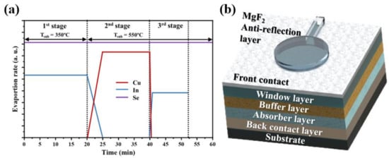 CISe thin film photodetectors were fabricated on top of an SLG substrate. The SLG substrates were cleaned to remove organic contamination using acetic acid and deionized water prior to depositing the back contact layer. Molybdenum with a thickness of 1.0 μm was sputtered on SLG as a back contact layer with sputtering power of 300 W under low Ar pressure of 2 mTorr. The CISe layer was deposited using a three-stage co-evaporation process, which is shown in Figure 1a. The In2Se3 precursor layer was deposited during the first stage with a substrate temperature of 350 °C, followed by Cu and Se evaporation during the second stage with a substrate temperature of 550 °C. In the third stage, In and Se were co-deposited. Then the films were cooled within a flux of Se until the substrate temperature dropped to 350 °C. The 60 nm-thick CdS layer was subsequently deposited using a chemical bath deposition method. After RF magnetron sputtering of a transparent conducted oxide (TCO) layer consisting of a 70 nm thick i-ZnO layer and a 350 nm thick aluminum-doped ZnO layer (ZnO), a metal electrode consisting of a 50 nm thick Ni adhesion layer and 1 µm thick aluminum was deposited by e-beam evaporation to complete fabrication of the CISe based photodetectors. The 65 nm thick magnesium fluoride (MgF2) thin film was used for the antireflection coating to minimize the surface reflection. Schematic designs of the CISe thin film photodetectors are shown in Figure 1b. The diameter of the exposed area of the CISe-based photodetectors was 2 mm.