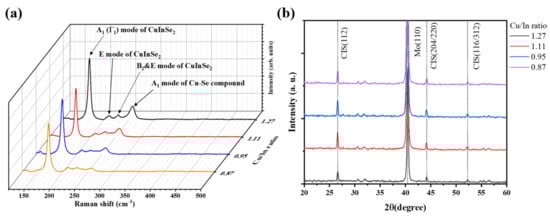 (a) Raman spectra and (b) XRD patterns of the CISe thin films with different Cu/In ratios.
