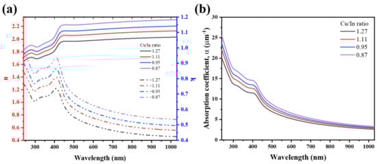(a) Refractive index, n, extinction coefficient, k, (b) the absorption coefficients of the CISe layers with variable Cu/In ratios.