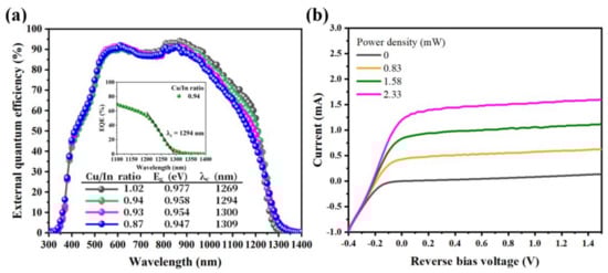 The external quantum efficiency (EQE) curves of the CISe thin-film photodetectors with various Cu/In ratios are compared in Figure 5a. The cut-off wavelengths were extracted by extrapolating the EQE curves as shown in the inset of Figure 5a and were utilized to calculate bandgap energies. The bandgap energies of the CISe thin films were tuned by varying the Cu/In ratio from 0.87 to 1.02. As the Cu/In ratio decreased, the bandgap energy decreased, which indicates that an increased cut-off wavelength was realized. The longest cut-off wavelength (1309 nm) was obtained from the CISe thin film having the Cu/In ratio of 0.87. Figure 5b shows the bias current–voltage (I–V) characteristics of the CISe thin-film photodetector in the dark and under 1064 nm laser illumination whose power ranged from 0.83 to 2.33 mW. The CISe-based photodetector with the Cu/In ratio of 0.93 exhibited the dark current density of 28.82 mA/cm2 and the differential resistance of 13.24 kΩ at −0.4 V. The low differential resistance is due to the large shunt leakage current. The dark current and responsivity values of the CISe-based photodetector were compared with those of the previously reported CIGS-based photodetectors in Table 1. Further material growth optimization is required to reduce the dark current and to enhance the differential resistance of the CISe-based photodetectors. In the forward biased condition, the current was almost constant, exhibiting the photovoltaic mode of the device. In the reverse biased condition, the current increased gradually with increasing laser power densities up to 2.33 mW, exhibiting a linear response. This current linear response dependency on the incident optical power is favorable for the photodetectors. The responsivity of the CISe thin-film photodetector was 0.52 and 0.60 A/W at 0 V and −0.4 V, respectively.