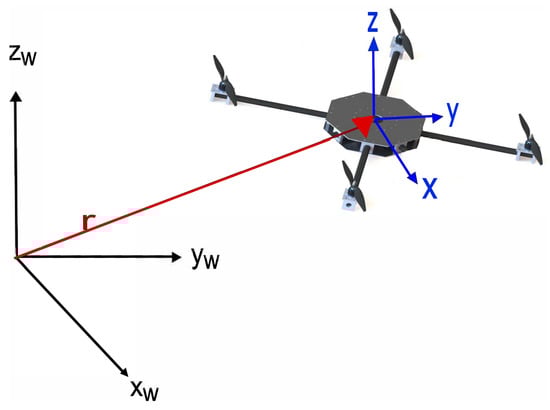 As shown in Figure 1, to describe the motion of QUAV in 3D space, this requires the definition of two frames: the inertial World frame, W, and the Body frame, B. The first is a fixed coordinate system on Earth with –– and the second is fixed on the structure of the vehicle, denoted by x–y–z.