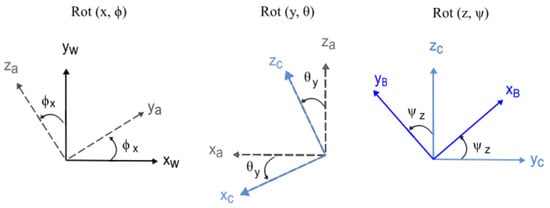 The rotation matrix from B to W, is given by , where , , , represents rotations about X, Y and Z axis, respectively, in that order, as shown in Figure 2.