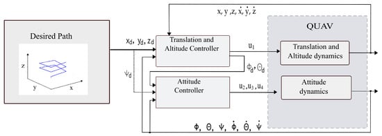 In order for the QUAV to follow a predetermined path in three-dimensional space, the control of trajectory tracking is proposed as Figure 3, where we introduce the desired positions to the Translational and Altitude Controller, which computes the control signal and determines the desired angles , which in turn are the references to the Attitude Controller. The Attitude Controller calculates the control signals and for orientation dynamics.