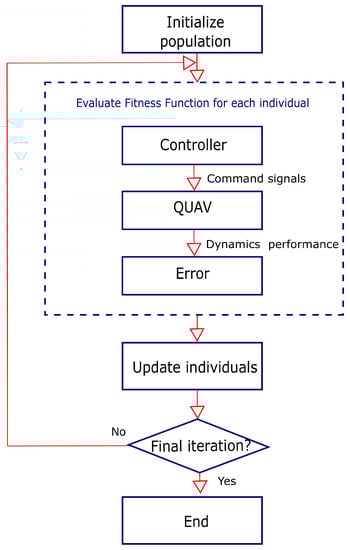 Figure 4, shows the implemented scheme for the controller parameterization, where each of the metaheuristic algorithms is evaluated. Initially, the population of the algorithm is generated and evaluated. The algorithm delivers a set of gains, which are applied to the designed controller, which in turn calculates the control signals for the QUAV. Then, the dynamic performance of each of the and Z axes is measured to calculate the error between the desired dynamics and the real one. This cycle is repeated until the number of iterations initially determined is reached or until the error or cost function reaches a set value.