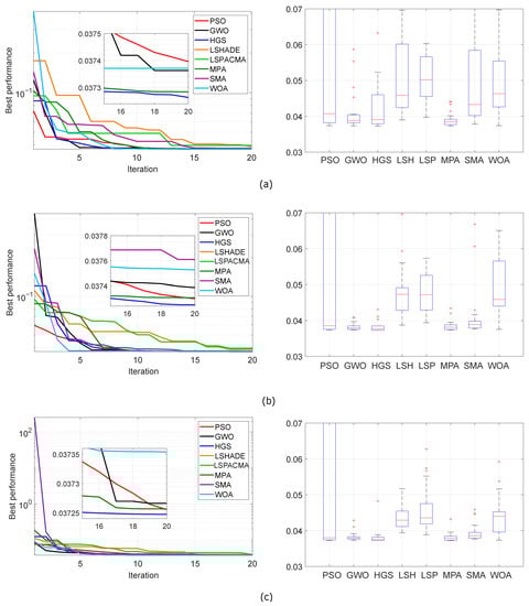 Convergence curves of RMSE and boxplot distribution of the different algorithms, iterations and individuals. (a) 20 individuals, 20 iterations; (b) 30 individuals, 20 iterations; (c) 40 individuals, 20 iterations.