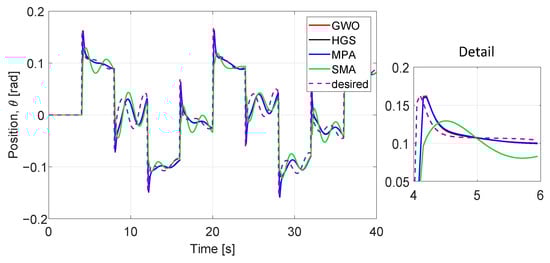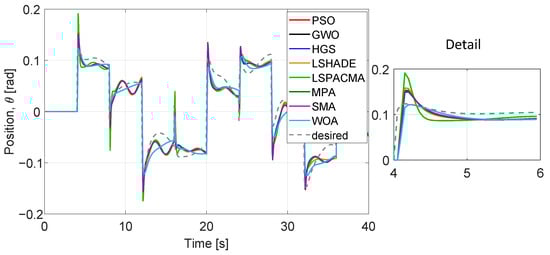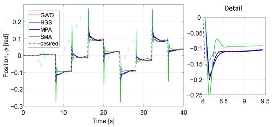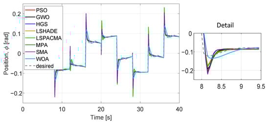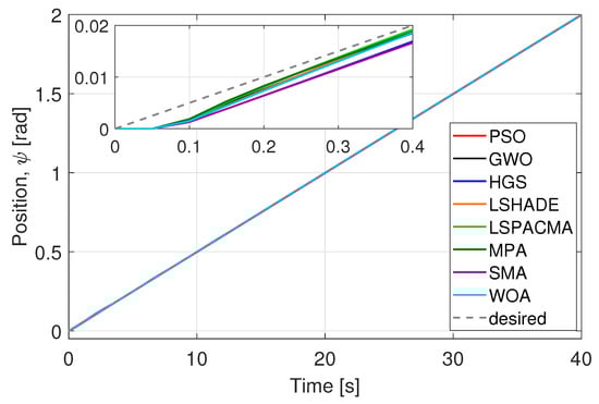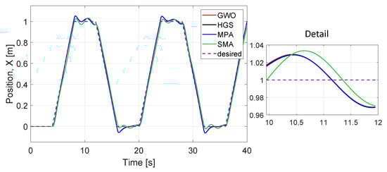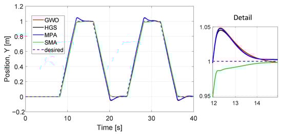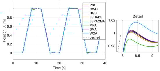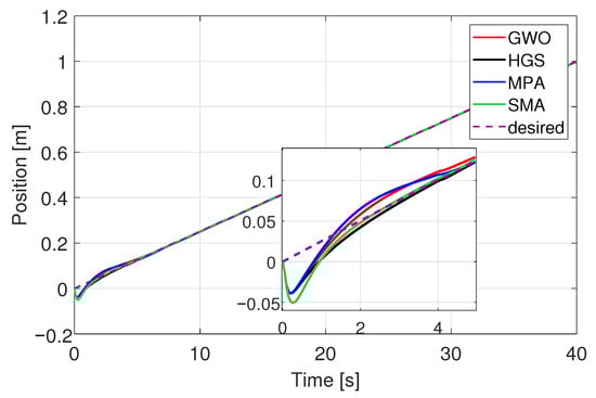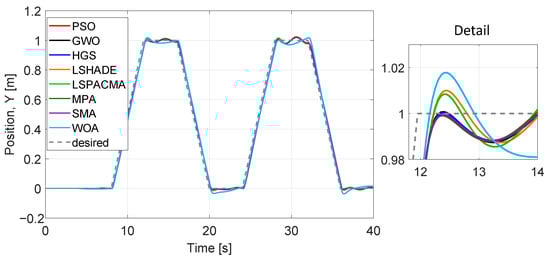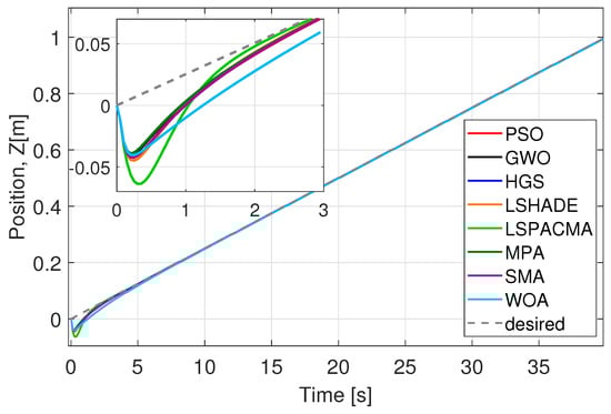 We evaluated the performance of optimized parameters obtained (Table 10) for all six dynamics, (x, y, z, ) and algorithms (Figure 16, Figure 17, Figure 18, Figure 19, Figure 20 and Figure 21) at 40 iterations with 100 individuals. The desired trajectories are the same as for the PD controller experiment. The best trajectory is determined by the minimal value of cost function achieved by HGS as shown in Table 9. The similarity of the performance of the six dynamics with the PD controller implementation can be noted, even when the number of parameters to optimize is larger and the number of individuals is bigger.