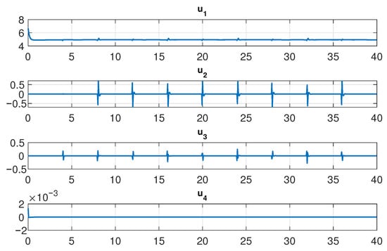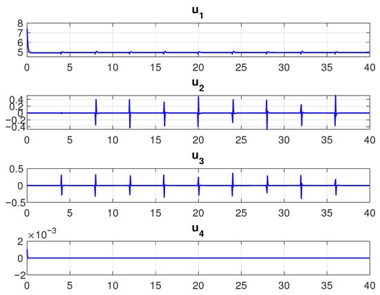 Figure 22 shows that the signals calculated by the PID controllers stabilize the dynamics. The control signals are very similar to Figure 12 since the desired path is the same. In the same way, as in the PD control, signals and respond to changes in direction on the desired path and is affected and responds to small variations in altitude. The dynamic of converges in minimum time and consequently, the control signal is kept at a small value.