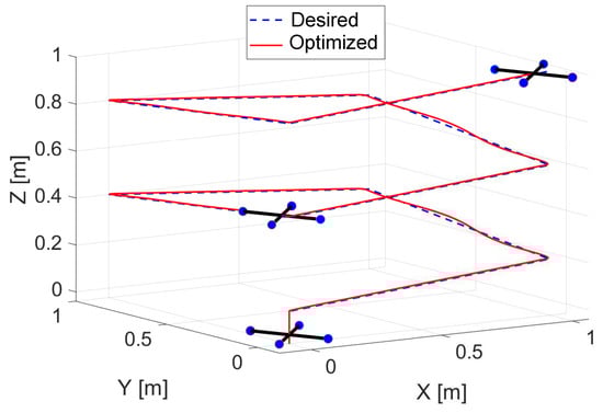 Finally, Figure 23 shows the successful trajectory tracking in X–Y–Z space, evaluating the optimized parameters of PID controller using HGS algorithm with 100 individuals. With the same optimized parameters, we consider a different path. The desired trajectory is a sinewave for translational dynamics (x and y), and altitude (z) is a step. We found that the QUAV can perform it effectively, as shown in Figure 24.