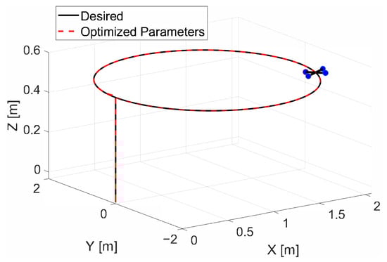 Tracking performance in three–dimensional space with optimized parameters of PID controller using HGS algorithm with 100 individuals.