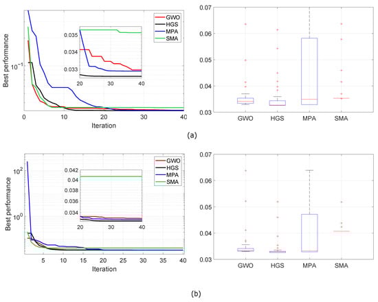 From the previous section, the four algorithms with the best fitness during tuning of the PD controls were GWO, HGS, MPA and SMA; these are taken for the PID control. Eighteen parameters were identified (Equation (17)), so it was necessary to increase the number of individuals. Here, two simulations are reported, one with 80 and one with 100 individuals. The number of evolutions and repetitions is 40 and 30, respectively.
