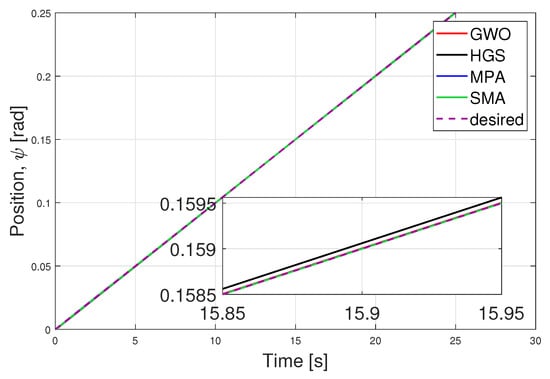 We evaluated the performance of optimized parameters obtained (Table 2) for all six dynamics, (x, y, z, ) and algorithms (Figure 6, Figure 7, Figure 8, Figure 9, Figure 10 and Figure 11) at 20 iterations with 20 individuals. For translational dynamics (x and y), the desired trajectory is trapezoidal and for altitude (z) and yaw () dynamics is a ramp. The sharp effect observed in the Z axis of Figure 8 is due to the compensation between the force of gravity and the control signal. Negative values are associated with the instant in which the value of gravity is more significant than the control signal. Please note that this effect is only visible in the simulation; in real life, this effect is observed as a time delay until the force of gravity is countered by the control signal. The best trajectory is determined by the minimal value of cost function achieved by HGS as shown in Table 1.