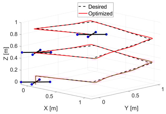 Tracking performance in three–dimensional space changing desired trajectory. The optimized parameters of PID controller obtained and HGS algorithm with 100 individuals.