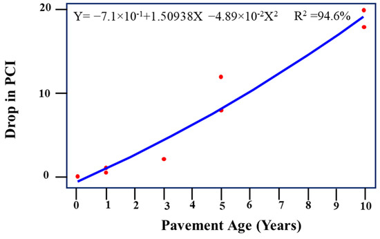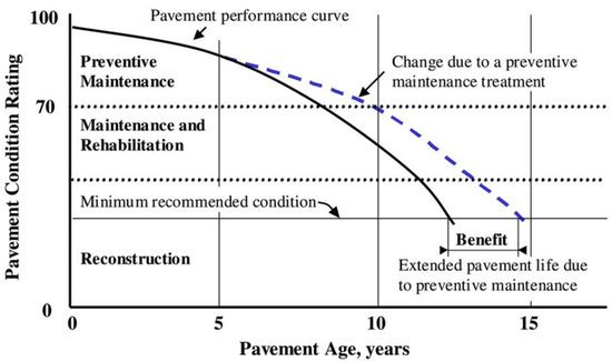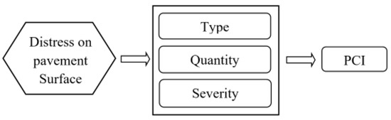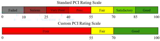 A pavement performance curve describes the relationship between pavement conditions with pavement age or traffic level. The performance of the pavements was assessed to determine whether they were good or poor [4,5]. Pavement conditions can be determined through performance indicators such as pavement distresses, riding quality, structural adequacy, and skid resistance. These performance indicators can be combined into one index, e.g., the pavement condition index (PCI) has been widely utilized to allocate pavement maintenance strategies [6]. As shown in Figure 1, PCI values are computed based on visual assessment and indicate the types of distress, magnitude, and quantity present on the pavement surface [5]. The PCI provides the evaluation of the pavement’s state, with scores ranging from 0 (failed) to 100 (excellent), as illustrated in Figure 2.