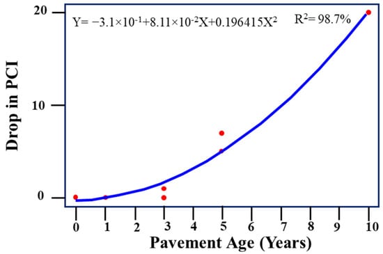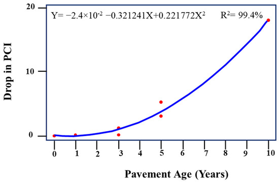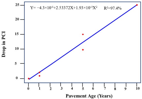Figure 5 and Figure 6 show the regression performance models for the no M&R strategy for a low- and high-traffic case, respectively. Performance models for routine maintenance are shown in Figure 7, Figure 8, Figure 9 and Figure 10 show the overlay strategy for low and high traffic, respectively. Finally, Figure 11 and Figure 12 show regression performance models for the reconstruction strategy for low and high traffic, respectively.