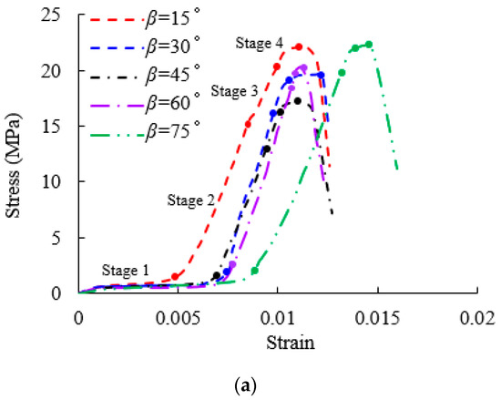 Figure 3 shows the stress–strain curves of the specimens under uniaxial loading. The uniaxial compression process of the single-crack concrete specimen can be divided into four stages: (1) The nonlinear compaction stage where mostly internal micro-cracks are present in the specimen. The strain is small, and the stress remains unchanged, resulting in a relatively smooth curve. (2) The linear elastic deformation stage, with no obvious crack development. (3) The stable crack expansion stage. The slope of the curve gradually decreases as wing cracks form and develop rapidly with increasing loading. When the slope of the curve is close to zero, secondary cracks often occur in the periphery of the wing cracks. (4) The unstable crack expansion stage. At this stage, the stress reaches its limit and the material loses its stability; the wing cracks expand rapidly, reaching the specimen surface, then the curve falls suddenly, indicating quasi-brittle failure.