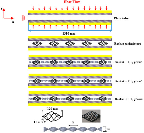 Kurnia et al. [29,30] summarized the contribution of entropy production due to both heat transfer and viscous dissipation, in addition to the Bejan number over different twisted band designs, and found that helical tubes having twisted-tape inserts exhibit poorer heat entropy production compared to tubes without. This suggests that for heat transfer equipment, a helical tube with a twisted-tape insert appears to be more effective. The augmentation of heat transmission by various types of inserts, as described in the preceding literature, is largely reliant on the designs and geometries of the inserts. In light of this, it is created a novel design of inserts (basket turbulators) to improve a tubular heat exchanger. When compared to a heat exchanger without inserts, basket turbulators with a spacing ratio of 4.2 can increase heat transfer rate by 115.9 percent, according to their research. The analysis of the work [31] indicates promising findings on the problem of heat transfer augmentation and inspires the current effort to extend the research using basket turbulators in conjunction with twisted-tapes swirl generators placed inside a circular tube under the same operating circumstances. The compound augmentation is supposed to provide a high heat transfer rate by introducing swirl flow and significant fluctuation. As a result, the thermal performance, heat transfer, and friction losses of a tubular heat exchanger coupled with compound augmentation, i.e., basket turbulators with twisted-tapes swirl generator with three twist ratios (y/w = 2, 3, and 6) are investigated experimentally in the current work. There is no evidence of such coupled augmentations in the literature. The experiments were divided into three parts: a study of the thermal performance, heat transfer rate, and friction losses of the basket turbulators in a turbulent flow regime (6000 ≤ Re ≤ 19,500) under constant heat flux, the introduction of a novel compound augmentation, and the development of empirical correlations to predict the rate of heat transfer and friction losses. Therefore, the novelty of the current paper is carrying out an experimental study on novel inserts using basket turbulators with twisted-tapes swirl generators.