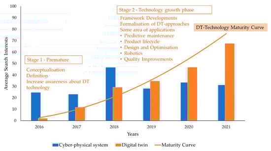 In recent years, interest in DT has grown significantly [17]. For instance, the value of the DT market was $2.26 billion in 2017 and is expected to reach $26.07 billion by 2025 [18]. Data gathered from Google trends (Figure 1) illustrates the pattern of individual search terms “DT” and “CPS”, with a year-on-year increase evident for DT. It is argued that the concept of DT has gained popularity due to its potential application across a wide range of sectors, including automobile, manufacturing and aerospace [19].